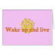 A bright yellow sun is the focal point of this fun design. The words "Wake up and live" pretty much say it all; get out there and experience all that life has to offer! Shake depression, remind your friends to quit sleeping so late, or just wear it because you like the sun :)