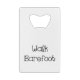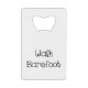 Text sayings T-shirts, mugs, bags, cards, stickers, key chains, wall clocks, notebooks, keepsakes, magnets, buttons, and more with black or white text that reads Walk Barefoot! You can change the background colour on these text sayings items to whatever colour you want!