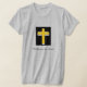 Religious quote and gold cross on woman's grey t-shirt was inspired while seeking Biblical answers to a personal issue.