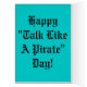 Talk Like A Pirate greeting card featuring the public domain art of noted pirate-themed illustrator and writer, Howard Pyle. Card reads with the captain saying, "Avast! If ye refuse to talk like a pirate, then ye shall walk like a pirate, ye scallywag," and the crew member responds, "Shove it up your booty, Captain A-crab. How 's that for a start?"
