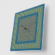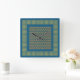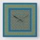 An attractive square Wall Clock, with a folk art-style, all-over pattern of little red and green hearts on a dark teal background and a green and teal check gingham pattern.