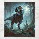 A massive Tyrannosaurus rex standing in a dense, alien prehistoric jungle, its scaly skin glistening under the dappled sunlight breaking through the towering trees. The T-Rex has piercing yellow eyes, jagged teeth bared in a low growl, and powerful muscles visible beneath its thick hide. The surrounding forest is filled with gigantic ferns, twisted vines, and ancient, moss-covered trees, evoking a sense of primeval wilderness. Mist rises from the damp ground, while a distant waterfall cascades in the background, adding depth and mystery to the scene. The atmosphere is humid and vibrant, with beams of golden sunlight filtering through the canopy, illuminating dust particles and creating a cinematic effect. The T-Rex's claws dig into the soft earth, leaving deep imprints as small creatures scurry away in the shadows.