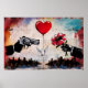 A large red heart balloon takes center stage, suspended between a gun and a flower, with a white dove perched below it. The background features a cityscape, while vibrant colors evoke a sense of contrast and tension.