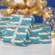 This illustrated wrapping paper has an all over pattern of walruses floating on ice bergs or sheets of ice. The realistic style walrus illustrations are set against a turquoise blue colored background.