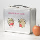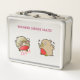 This is a standard metal lunchbox that appears to work just fine. We designed this box ourselves with an uploaded photo and custom text on the front and back. It looks absolutely beautiful except the front of the lunchbox is not centered like it shows in the photo. The print borders don't align with the inset flat part of the box where the preview photo online showed it perfectly centered in there. The back looks nice and centered though.