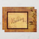 Fall leaves on burnished copper and brown background with scrolled wedding text on front and custom personalised wedding day details on back for the frugal yet elegant DIY bride and groom. Yellow accent frame with scrolls and flourishes. Inexpensive and stylish, your wedding guests will never know how little you spent at Budget Bridals