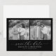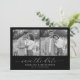 This wedding save the date features a split composition with two black-and-white photographs of a couple in an outdoor setting, capturing moments of intimacy and connection. The monochromatic colour palette emphasizes clarity and detail, creating a timeless and elegant look. The design includes cursive script typography for "save the date" and clean serif fonts for customisable event details, adding a personal touch to this straightforward yet sophisticated template. Perfect for conveying warmth and affection, it sets the tone for a memorable celebration.