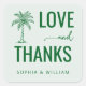 This wedding sticker features a minimalist design with a soft pale green background, creating an elegant and modern aesthetic. The central focus is on the bold, uppercase typography that reads "LOVE and THANKS," accompanied by a stylized palm tree illustration in dark green, adding a subtle tropical theme. The combination of structured sans-serif fonts and delicate cursive script enhances readability while conveying warmth and appreciation. Perfect for expressing gratitude at your special event, this sticker combines sophistication with a touch of nature-inspired charm.