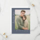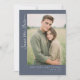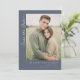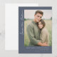 This wedding save the date design features a central photo of two individuals in an outdoor setting, surrounded by tall grass, framed within a rectangular border on a muted dark grey-blue background. The layout is vertically orientated with elegant cursive script at the top-left corner reading "Save the Date," and customisable text elements for names, dates, and location placed strategically at the bottom. The colour palette includes natural greens from the photograph, complemented by neutral greys and whites in the text, creating a modern minimalist style with rustic charm. The typography combines serif and sans-serif fonts to guide attention smoothly across the design, evoking warmth and anticipation. Perfect for couples looking to share their joyous news with friends and family, this design captures a moment of intimacy and connection.