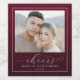 This elegant wedding wine label features a central photo placeholder framed by a rich maroon border, creating a warm and intimate atmosphere. The design showcases a couple in an outdoor setting with soft, natural lighting, emphasizing the celebration of love. Below the image, "cheers" is written in a flowing cursive font, adding a personal touch to the modern and sophisticated style. Perfect for commemorating special moments like weddings or anniversaries, this label combines photographic realism with stylish graphic elements to convey joy and affection.