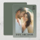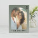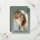 This wedding save the date card features a warm and intimate design with an oval photo frame showcasing two individuals in close proximity. The muted olive green background contrasts beautifully with the soft beige and white tones of their attire, creating a serene and inviting atmosphere. Elegant serif typography highlights key details, while clean sans-serif fonts add a modern touch to the layout. Perfect for announcing your special day, this card blends traditional charm with contemporary style, setting the tone for a memorable celebration.