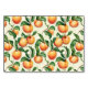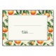 This wedding place card features a charming design with a repeating pattern of peaches and green leaves on a light cream background, creating an inviting and elegant frame around the central blank space. The warm orange hues of the peaches contrast beautifully with the various shades of green leaves, enhancing the natural theme. Customisable text fields allow for personalisation, making it perfect for adding names and table numbers in a stylish script font. The overall mood is fresh and sophisticated, ideal for weddings or formal events seeking a touch of whimsy and warmth.