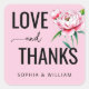 This wedding sticker features a soft pink background with a detailed peony flower illustration, accompanied by elegant green leaves. The design combines bold, uppercase typography with a cursive script to convey the heartfelt message "LOVE and THANKS." Its modern, minimalist style creates a warm and celebratory mood, perfect for expressing gratitude at your special event. The customizable names add a personal touch, making it ideal for weddings or romantic celebrations.