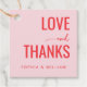 This wedding favor tag features a simple, elegant design with a soft pink background and vibrant coral red text. The phrase "LOVE and THANKS" is prominently displayed in bold, uppercase letters, complemented by a delicate cursive script for the word "and." The clean typography and minimalist layout create a contemporary and sophisticated look, perfect for expressing gratitude and affection at your special event. The warm color palette and gentle styling evoke feelings of love and appreciation, making it an ideal choice for celebrating your union.