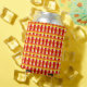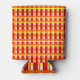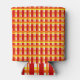 This can cooler has an Art Deco design of a plaid with thick and thin lines in red, orange, and yellow.