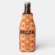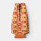 This bottle cooler has a mid-century modern design of rectangles stacked three thick in warm colours of red, orange, gold, and yellow on a field of white.