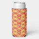 This seltzer can cooler has a mid-century modern design of rectangles stacked three thick in warm colours of red, orange, gold, and yellow on a field of white.
