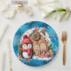 A Paper Plate Design In Blue With White Snowflakes And Winter Penguin And Gingerbread House Centre