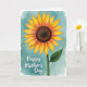 This card features a stylized flower centered in the design, with a dark brown, seed-like core textured to feel deep and detailed. Wide petals fan outward in a warm gradient, shifting from sunny yellow at the tips into softer orange and a gentle rosy blush closer to the center, like a tender glow held close ❤️. A sturdy deep green stem rises from below, and a single leaf leans out to the side, adding a calm, balanced touch that feels quietly affectionate. Behind it all, the background is a teal wash with a watercolor look, showing soft variations in tone and slightly uneven edges like open sky. In the lower left corner, a short message appears in flowing white lettering, standing out clearly against the teal. The overall layout leaves plenty of breathing room around the bloom, giving the scene an easy, friendly warmth 🌼. The petals show yellow on the outer edges fading into orange and blush near the dark brown center, with the white text anchored at the lower left.