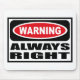 Warning ALWAYS RIGHT Mousepad you can customise at www.WarningSignShirts.com and features a red and black warning sign and ALWAYS RIGHT in bold black letters to warn the world. You can also customise your own warning sign Mousepad with the text you want.