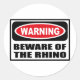 Warning BEWARE OF THE RHINO Sticker you can customise at www.WarningSignShirts.com and features a red and black warning sign and BEWARE OF THE RHINO in bold black letters to warn the world. You can also customise your own warning sign Sticker with the text you want.