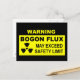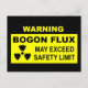A black and yellow warning sign with text reading, "WARNING, BOGON FLUX, MAY EXCEED SAFETY LIMIT."  A radioactive material warning symbol also appears. The bogon is an elemental particle which carries the property of bogosity, or being bogus (i.e., fake of bad).  All humans are natural low-level bogons emitters. Emission levels fluctuate over time.  Politicians, other individuals such as used car salesmen, are high level sources of bogons.  When such individuals emit extremely high levels of bogons, as when making campaign promises, a bogon flux may occur. A bogon flux can be very dangerous to those in the area. Bogon was originally hacker jargon having to do with bogus addresses on a computer network.
