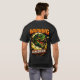 A vibrant graphic design featuring a Tyrannosaurus Rex emerging from a cracked egg. The dinosaur's vividly detailed face is positioned prominently, showcasing sharp teeth and intricate scales. The color palette blends greens and blacks with splashes of orange, creating a striking contrast against the yellowish eggshell. The background is minimal, allowing the main subject to stand out. Text elements, including 'WARNING' and 'CLASSIFIED', are incorporated in bold fonts, adding a dramatic effect. Light sources appear to highlight the dinosaur’s features, enhancing its fierce expression. The composition is dynamic, suggesting movement and energy as if the creature is breaking free from confinement.