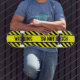 Skateboard in cool warning sign design. "WARNING - DO NOT TOUCH" Text is customisable.