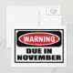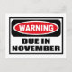 Warning DUE IN NOVEMBER Postcard you can customise at www.WarningSignShirts.com and features a red and black warning sign and DUE IN NOVEMBER in bold black letters to warn the world. You can also customise your own warning sign Postcard with the text you want.