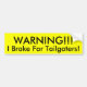 WARNING!!!, I Brake For Tailgaters! Bumper Sticker