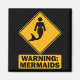 This diamond-shaped warning sign design shows the silhouette of a mermaid with text below reading "Warning: Mermaids."
