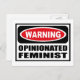 Warning OPINIONATED FEMINIST Postcard you can customise at www.WarningSignShirts.com and features a red and black warning sign and OPINIONATED FEMINIST in bold black letters to warn the world. You can also customise your own warning sign Postcard with the text you want.