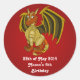 Classic Round Sticker with illustration of an orange armoured dragon with huge wings, winged dragon in golden armour, fantasy design for kids with template text