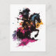 The design features a fearless warrior on a galloping horse in a unique, abstract art style. The silhouette is in dark tones, while dynamic splashes of pink, orange and yellow give the image an energetic, modern aesthetic. The warrior wears armour and holds a weapon, making the motif appear powerful and epic. Perfect for fans of mediaeval, fantasy and warrior art.