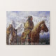Native American art puzzle, Ute tribe The image in this puzzle comes from a James Ayers original painting, Warriors of the High Country (2008, Ute tribe). These two Ute travelers are prepared for both the environment and any strangers they might encounter. The front rider, clad in elk hides, keeps a vigilant lookout and carries his arrow quiver. The back rider, covered in a buffalo robe, has a gun case for a Kentucky long rifle. The rifle case dates this image to the early 1800s, as does the Hudson Bay blanket used by the front rider. More information about this painting and the artist, James Ayers, available on the artist's website: http://jamesayers.com/prints-and-giclees/fine-art-giclees/warriors-of-the-high-country-giclee/