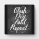 A fancy laundry room themed design. A chalkboard style sign which says wash, dry, fold repeat in a cute whimsical swirly font.