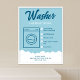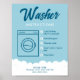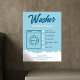Create modern laundromat instructions wall signage using this white and blue Washer Instructions poster design. Featuring pastel blue and white colors, washer graphic, trendy fonts, soap bubbles motifs and a professional layout. You can edit all text, colors and even add your logo! Create custom appliance instructions for washers to display in your laundromat.