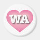 This magnet features a cool pink heart with a white-washed centre containing the bold, white, upper case letters WA, the official abbreviation for Washington, the evergreen state.