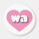 This magnet features a pink heart containing the bold, white, rounded, lower case letters wa, a playful abbreviation for Washington, the evergreen state.