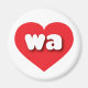 This magnet features a vibrant red heart containing the bold, white, rounded lower case letters wa, a playful abbreviation for Washington, the evergreen state.