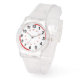 I only have one complaint. I ordered the watch with clear case and strap, and what was sent was white case and strap. I'm going to keep it because 1) it looks very nice in white, and 2) it would take too long to get a replacement made and sent in time for my occasion. Aside from the mix up with the color, the watch does look very good in white. The purple dial is actually sparkly which did not show in the online images. That was a nice surprise. If you like Swatch watches this is very similar to those. It's 33.6mm in diameter, 10.5mm thick, and 40.6mm lug to lug. Stainless steel case back says 3ATM/30m WR, so no swimming or showering or submerging this one. If you like Woodstock, this is a great choice.