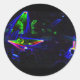A DJ under the laser and ultra violet lights, spinning for the onlooking crowd.