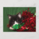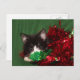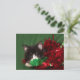 Black and white tuxedo kitten thinks he's hidden behind the garland as he waits and watches for Santa Claus cute cat lovers Christmas holiday postcard