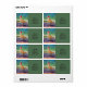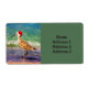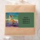 Address label with a cute water bird wearing a red Santa hat, and on a sandy and tropical beach.
