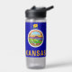 This water bottle proudly displays the flag of Kansas, which features a dark blue field with the state seal in the centre. The seal includes a landscape with a rising sun, a river, a steamboat, a cabin, and a settler ploughing a field. Above the seal is the state motto "Ad Astra Per Aspera" (To the Stars Through Difficulties).
