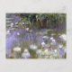 A fine art postcard featuring the impressionist painting, Water Lilies (c 1922) by Claude Monet (18401926). This work is part of a series of water lily paintings by Monet, inspired by his own ponds at Giverny, France. A pond with pink water lilies on lavender hued water and green reeds.