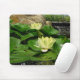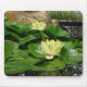 This photo evokes a peaceful summer afternoon by a water lily pond. Two white water lilies stand out against the green leaves and the rocks in the background.
