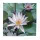 Water lilies grow in a small pond, among glossy lily pad leaves.