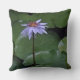 The image on this 20” Throw Pillow is an original photograph by MaeFlowers of a water lily, a flower blooming amid the lily pads floating on the water. The flower is a lovely lavender blue colour, standing out from the dark green, round lilypads.