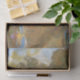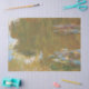 Water Lily Pond by Claude Monet, oil on canvas 1917-1919, is a panoramic landscape of lily flower pads floating on placid water, with warm green reflections of surrounding plants, trees and sky encompassing the entire view. Monet painted the lilies in the large flower garden that surrounded his home and studio in Giverny, France. With broad, almost sketchy strokes of loosely applied, lush strokes and scumbles of oil colours, the artist dematerialises the distinctions between solid form, water, atmosphere, light, and colour to create an image of near abstraction. Many of the late paintings of Monet powerfully influenced the abstract schools of painting of the 20th century, and remain some of his most beloved works to this day.